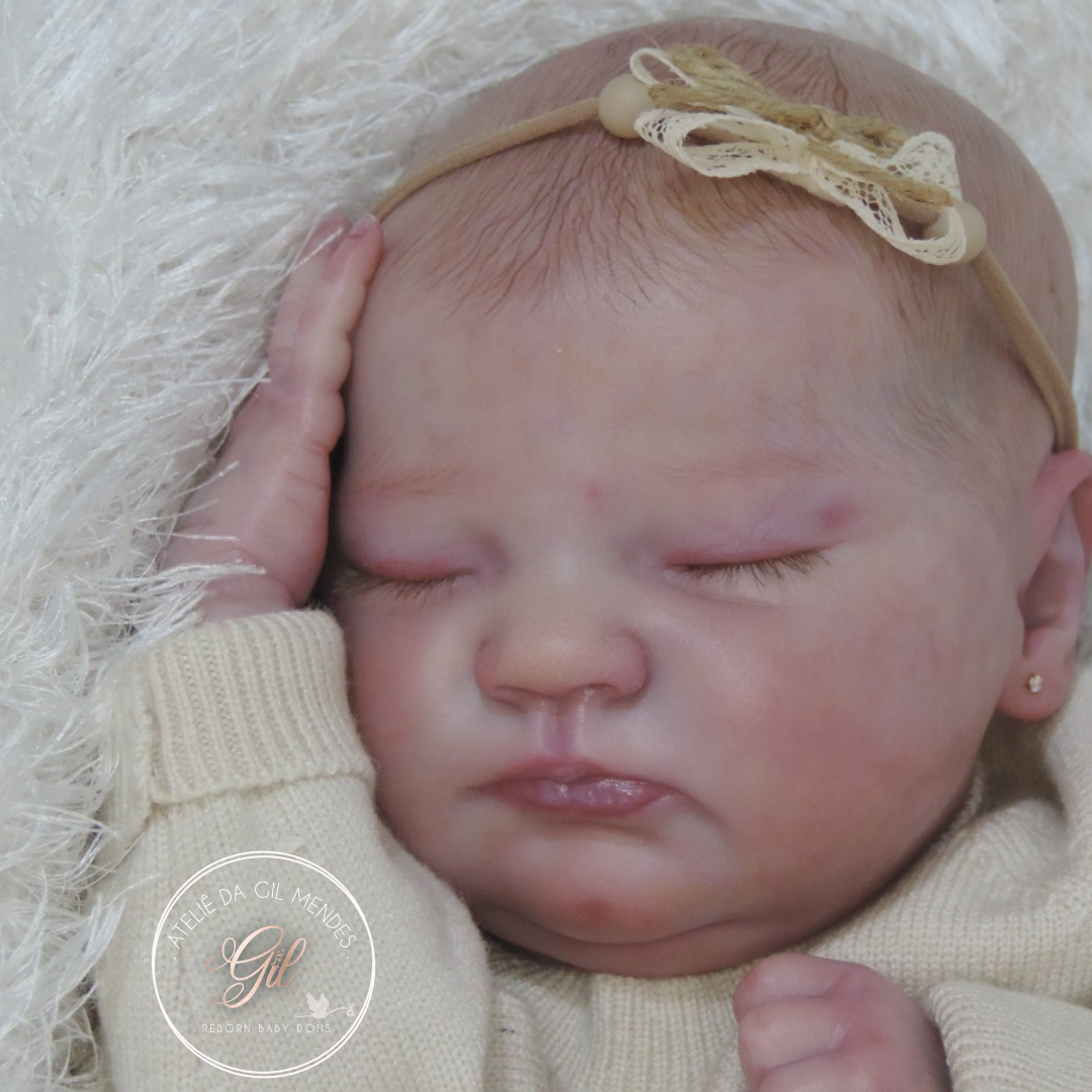 Bebê confeccionada com técnicas de pintura realista, cabelo pintado, corpo de tecido, mede 45 cm e pesa 1.900 kg.