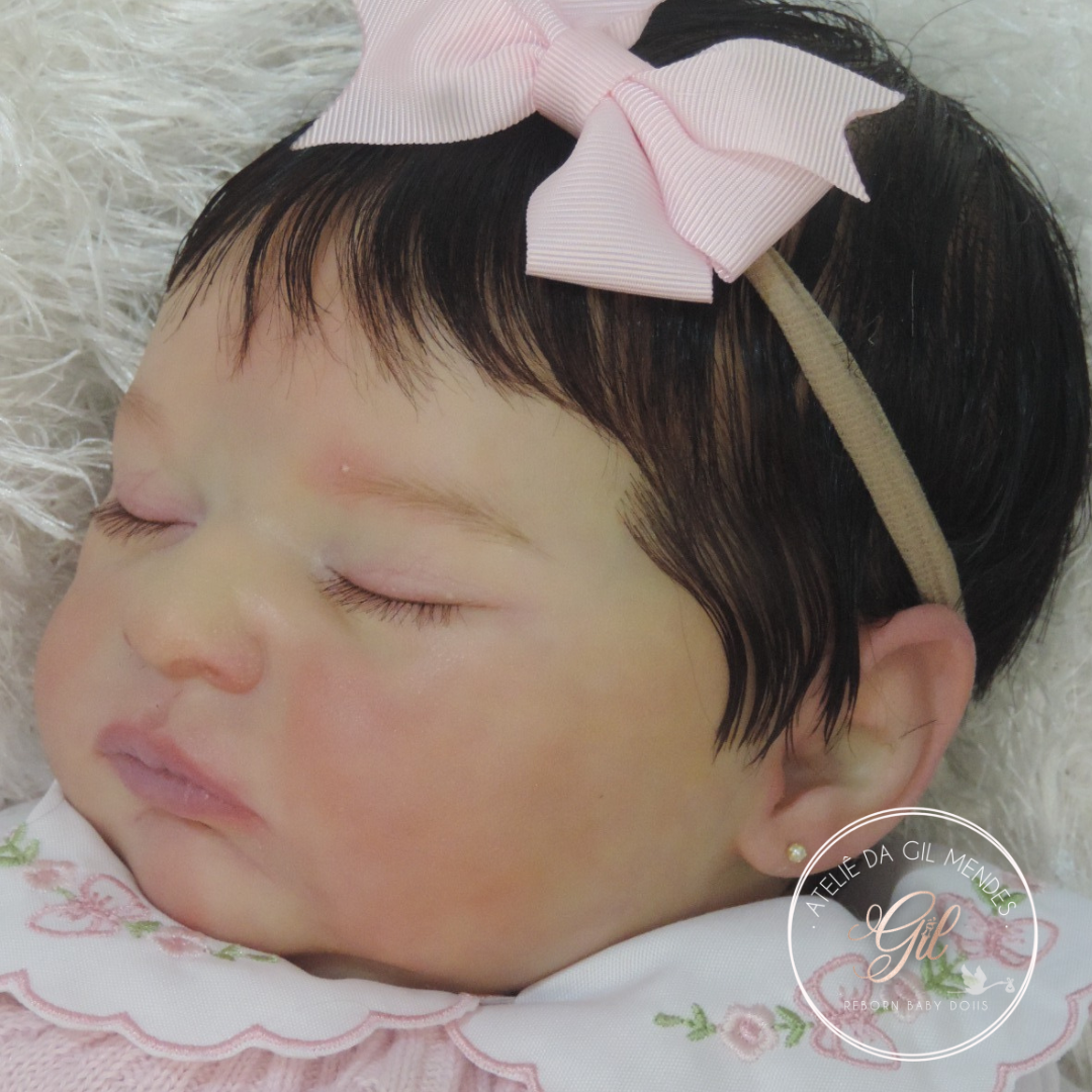 Bebê confeccionada com técnicas avançadas de realismo em varias camadas, descamação de pele, marquinha de vacina.....corpinho de tecido Suede, cabelo implatado fio a fio com fibra beautex castanho escuro, mede cerca de 50 cm e pesa em média 2,400 kg. Acompanha acessórios, chupeta magnética, prendedor de chupeta, mamadeira com leite falso, fralda descartável, spray condicionador, água de colônia, pente e escova, lacinho bico de pato, tiara, naninha e documentos, tudo embalado em cx de presente. Vai pra casa com uma roupinha da foto, brincos folheado a ouro.